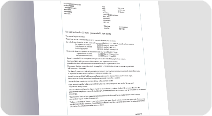 HMRC postal SA302 Self Assessment Tax Calculation 1 LOGO Self Assessment: Tax Calculation 205077:000000000001:001 UTR 12345 6780 MRA SOMEONE NNO AA112233A 1 ANYTOWN ROAD Date 01 May 2017 ANYTOWN Issued by: ANYWHERE HM REVENUE & CUSTOMS AN1 9GG ANY OFFICE ANYTOWN ANYWHERE AN1 3YY Telephone 12345 6789101 Issue No: 2017/001 Tax Calculation for 2016/17 (year ended 5 April 2017) Thank you for your tax return. We enclose our tax calculation based on the amounts shown in your tax return. Our calculation shows the tax due under Self Assessment for 2016/17 is £15,065.78, payable in three amounts: 1st payment on account £6,298.22 due by 31 January 2017 2nd payment on account £6,298.22 due by 31 July 2017 Balancing payment £2,469.34 due by 31 January 2018 We also calculate the payments on account towards your tax bill for 2017/18 are: 1st payment on account £7,532.89 due by 31 January 2018 2nd payment on account £7,532.89 due by 31 July 2018 If your income for 2015-16 has gone down you can ask to reduce these payments on account. Find form SA303 Self Assessment claim to reduce your payments on acc ount at gov.uk/understand-self-assessment-statement/change-your-payments-on-account Please note the total amount due by 31 January 2018 is £10,002.23. We will add this amount to your SA300 Self Assessment Statement. The above figures do not take into account any payments you may have made towards amounts due on these dat es, or any other amounts which may be outstanding or becoming due. You will receive an SA300 Self Assessment Statement nearer the due date telling you how much t o pay. Please note we charge interest and penalties on payments made after a due date. You can find out how to pay us at gov.uk/pay-self-assessment-tax-bill If you are registered for Self Assessment Online, log in at online.hmrc.gov.uk and use the ‘View acc ount’ pages to see what you owe. This tax calculation is based on figures in your tax return, before it has been checked. It is not our confirmation that your return is complete or correct. If, at a later date, your return is found to be incorrect, your tax calculation will be amended accordingly. The amount of Student Loan repayments included in this calculation will be reported to Student Loans C ompany and credited to your Student Loan account. We have sent a copy of this notice and calculation to your agent. We will write to you and your agent again if we have any questions about your tax return. Please let us know if there is anything you do not agree with or do not understand in our calculation. Our telephone number is shown above. 5 SA302 Page 1 HMRC 06/13 All figures used are for illustrative purposes only All figures used are for illustrative purposes only Without supplying all requested proofs your case can’t progress to Case Assessment stage. Nationwide Building Society, Nationwide House, Pipers Way, Swindon, Wiltshire, SN38 1NW. Correct at time of going to print. F1062 2FWREHU